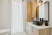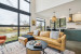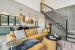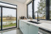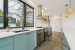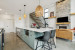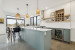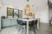 Le salon s'ouvre sur une cuisine au design contemporain, dotée d'un immense îlot central avec coin repas ainsi que d'une grande surface de comptoir supplémentaire sur le mur arrière. Un espace convivial, parfait pour recevoir famille et amis, grâce à son aire ouverte et ses nombreuses fenêtres.