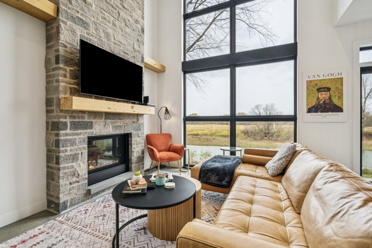 Le salon, véritable pièce maîtresse de la maison, se distingue par son haut plafond et son impressionnant mur de fenêtres pleine hauteur, laissant entrer une abondance de lumière naturelle et offrant une vue imprenable sur le Chenal-du-Moine. Le foyer au gaz, encastré dans un élégant manteau de pierres, ajoute confort et raffinement à l'ensemble.